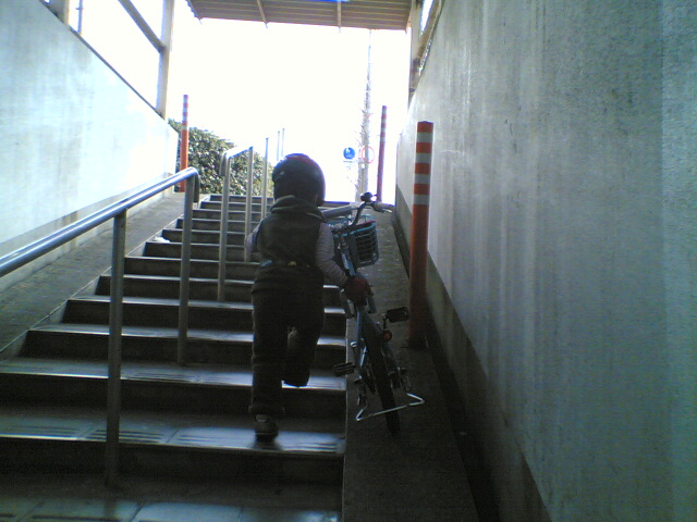 頑張って自転車押して階段上がって行ってます。
